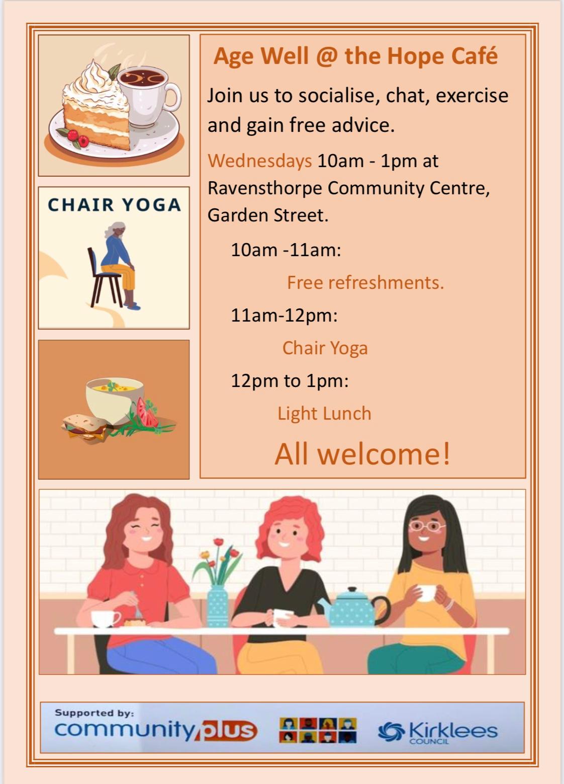 Our Champions lead on health activities such as walking groups, coffee mornings, wellbeing groups (dimentia; womens health; etc) and the Hope Cafe.
